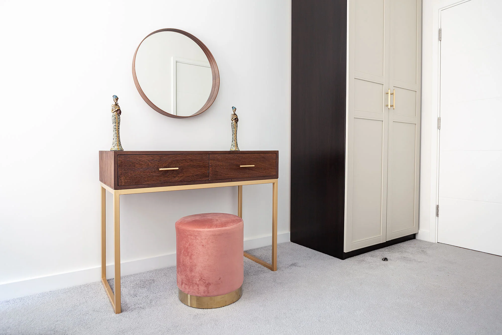 This design features simple but effective touches such as a beautiful walnut table with brushed metal finishing as well as plush velvet dining chairs. Rich burgundy and neutral hues can be felt throughout the home. Including custom-made light fixtures by Copper Dust in every room.