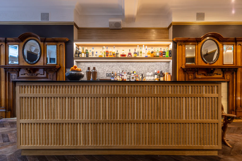 2. Use the floor to create zones. In The Guildford Arms, there is a beautiful checkered floor tile with a gold trim that flows effortlessly to the wood floor. Details such as this make for great design.