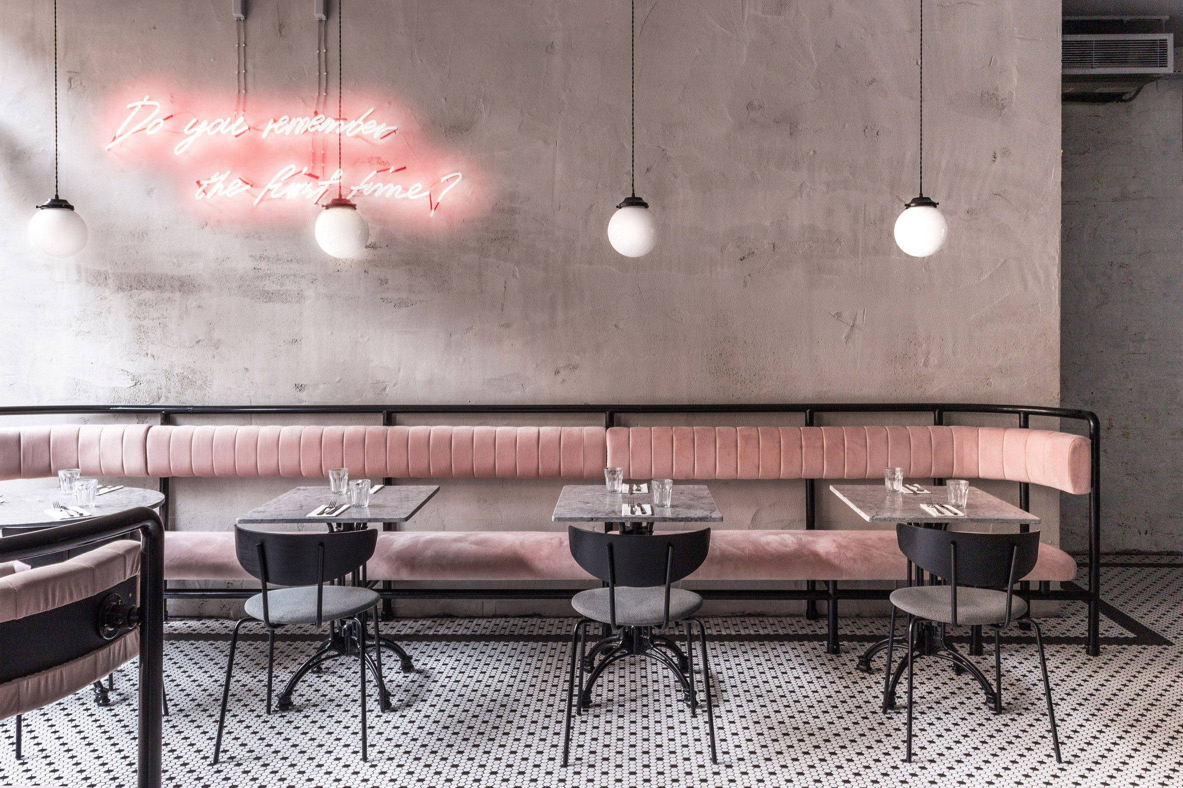 Designed by Melbourne-based studio Biasol, Grind in Greenwich is a masterclass in creating the ultimate zone areas in an open-plan area. The cocktail bar wall is drenched in a deep teal, which embraces the darker corner, with minimalist bar stools. The checkered floor provides a beautiful contrast, complimented by the marble worktops. The main dining area is flooded with natural light with an atrium-style roof, with large bifold doors leading to alfresco-style dining. Here are 4 tips to incorporate this style into your home: