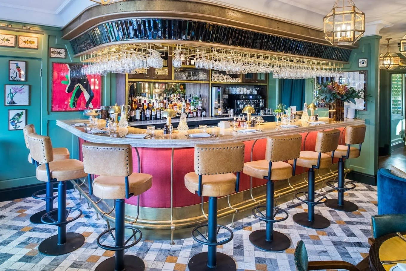 Located in the picturesque village of Blackheath, The Ivy is a stunning restaurant that boasts a Parisian Art Deco interior. The ambience is reminiscent of the 1920s era, with its lively music and dancing flappers. Martin Brudnizki Design Studio meticulously crafted the restaurant's design, and every detail was carefully considered. As soon as you step into the space, your eyes are drawn to the mesmerising wall art, featuring botanical and exotic bird designs in a range of vibrant colours. The main brand colour palette is mint green, which is beautifully incorporated throughout the space.