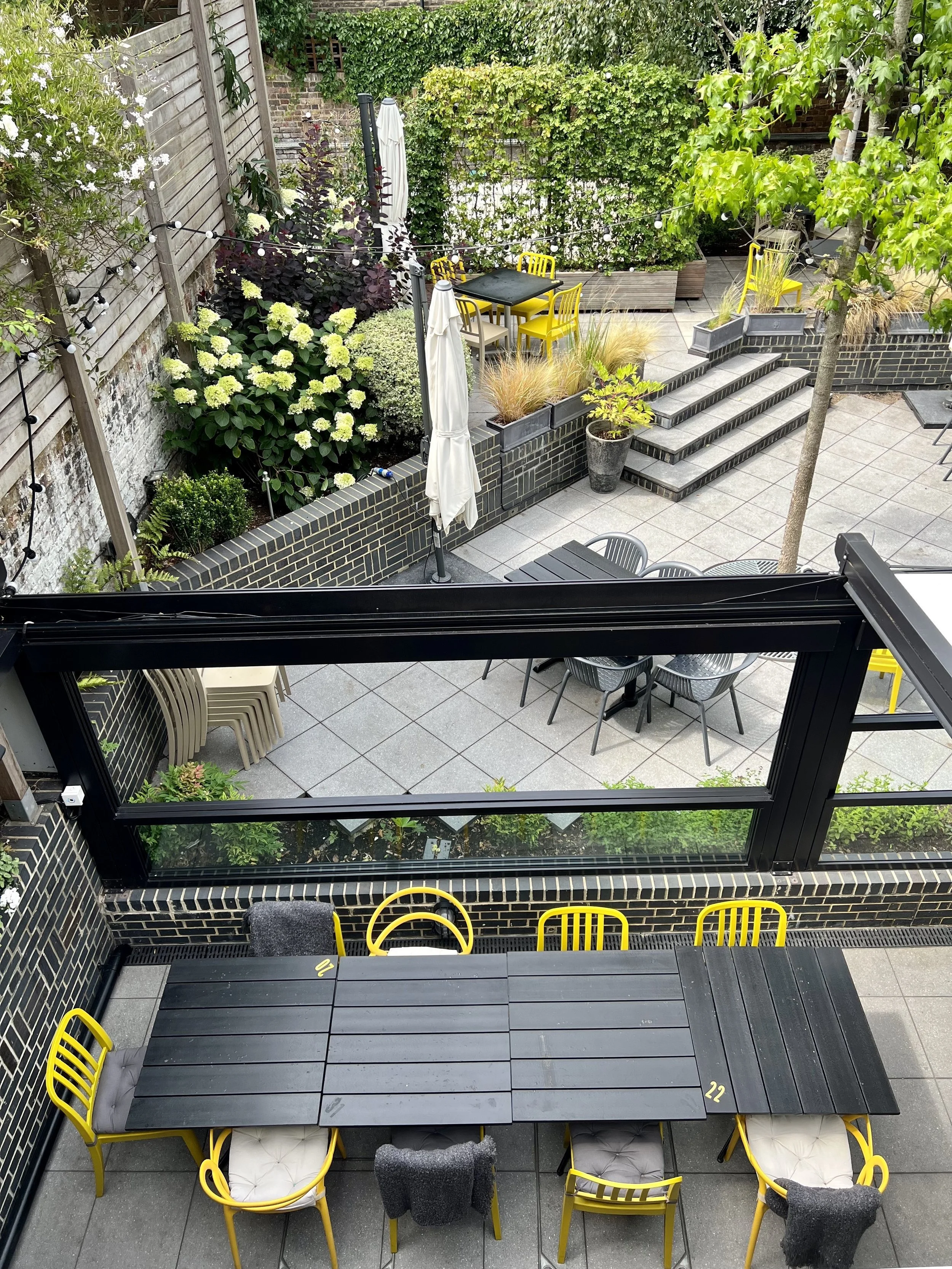 The basement is where the venue truly comes to life. The dining area opens up into the garden area, and you also have the chance to interact with the kitchen. This is a great use of open spaces, creating cohesion between each space. The garden area has a clean and simple design, with dark brickwork that continues the theme of the interior. Paired with neon yellow garden furniture, it brings energy into the space. The varying heights throughout the outdoor space create flow in a large area while still having pockets of intimacy. Here are four tips to incorporate this style into your home: