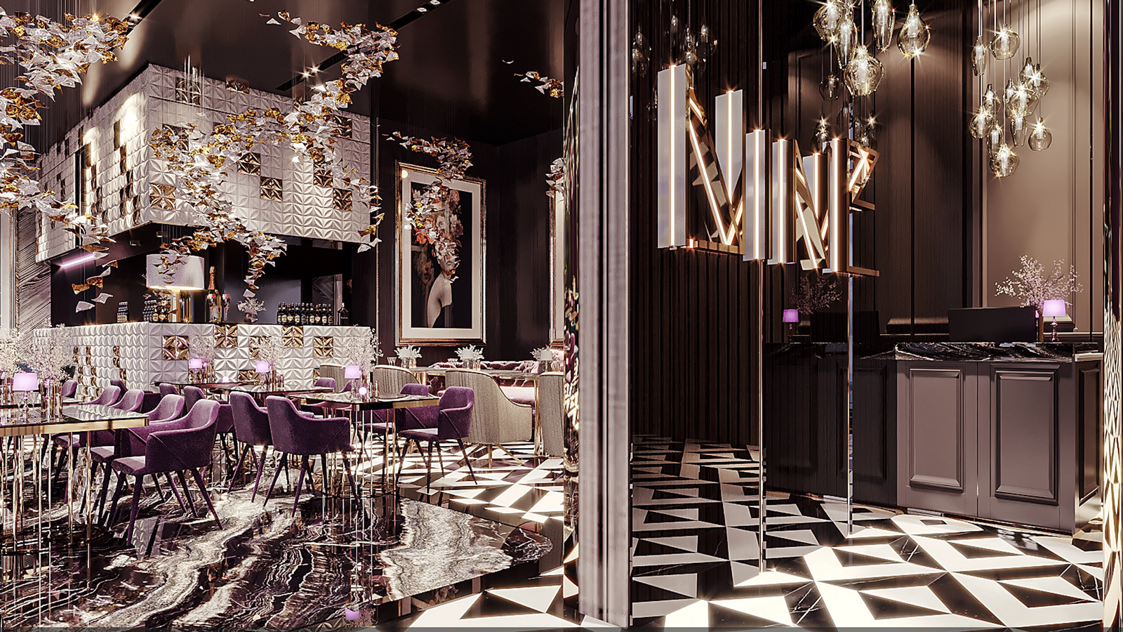 The plush purple dining chairs signify opulence and set the tone for the overall dining space. The flooring adds another statement the large marble effect running throughout, which complements the darker wall finish. The mirrored ceiling makes the space feel bigger, especially whilst overlooking the skyline. Here are 4 tips to incorporate this style into your home.