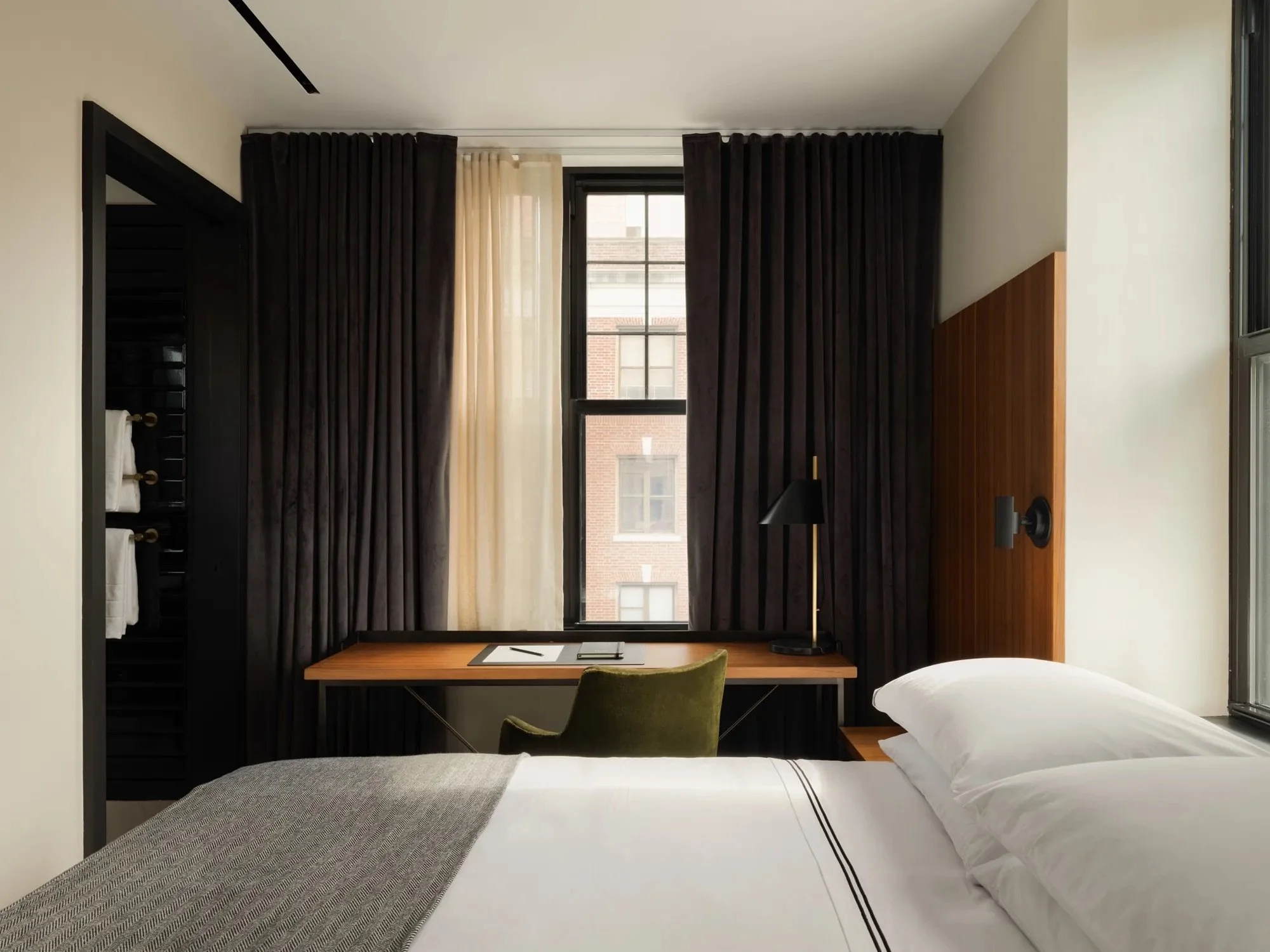 The lobby, with its curvy upholstered sofas, patterned floor tiles, and charcoal velvet drapery, feels like an intimate living room. The bedrooms continue the clean, luxurious aesthetic with wood-panelled headboards and crisp white bed linens.