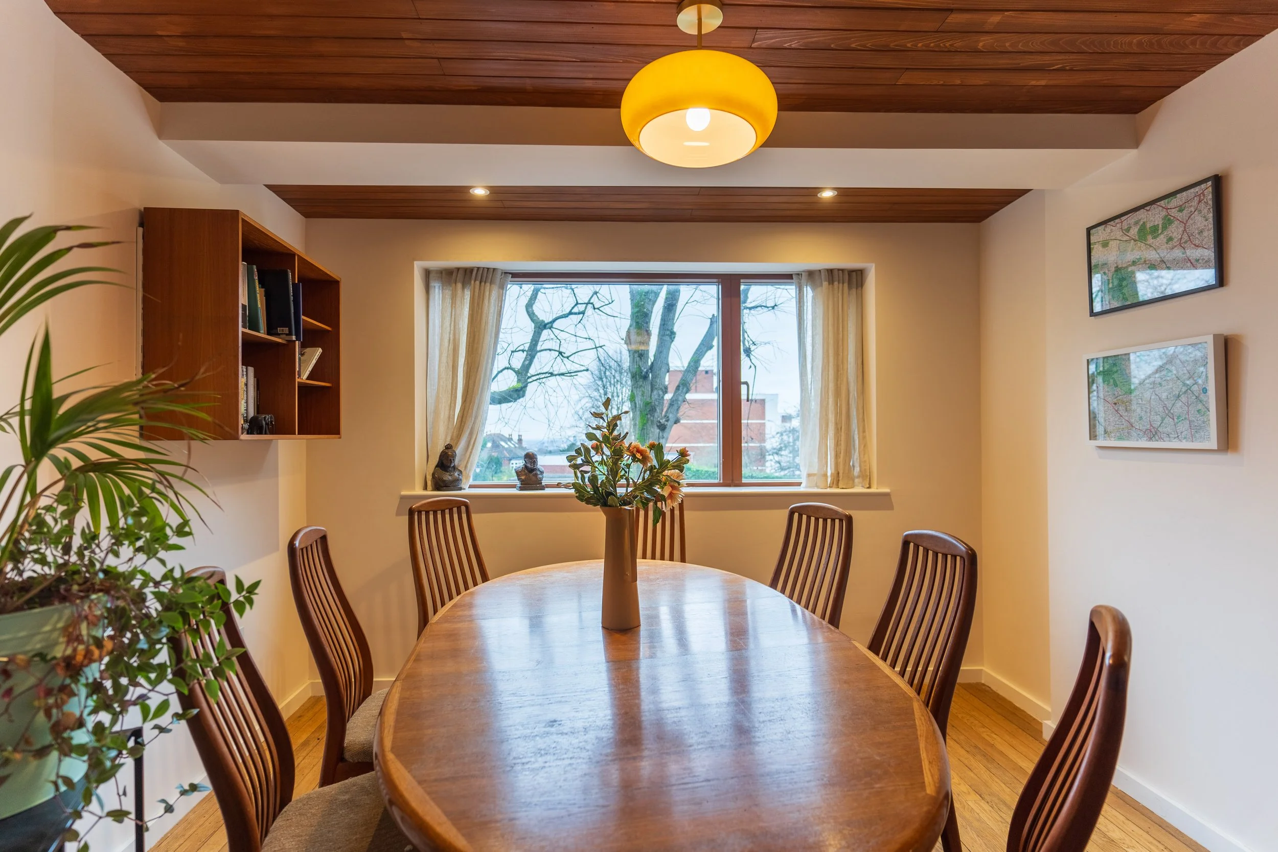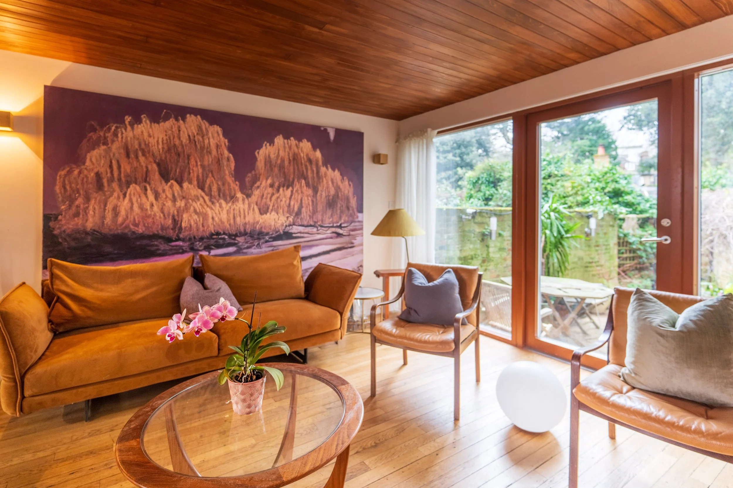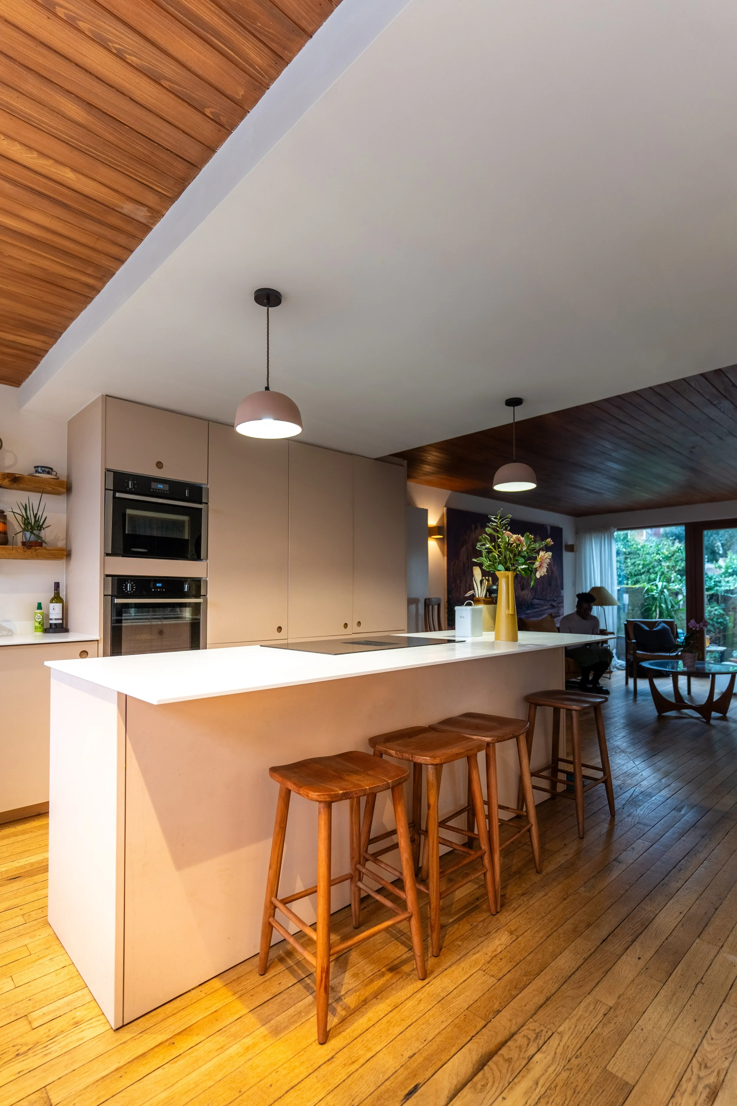 The standout feature is the original wood-panelled ceiling, which we carefully preserved to celebrate the home’s character. Splashes of colour and thoughtfully layered textures bring warmth and vitality, while the cohesive palette ensures a refined, harmonious feel throughout the residence.
